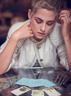 Algunas horas antes, Stewart estaba vestida en un vestido largo color crema mientras posaba para la sesión de fotos de Bazaar en el apartamento de Coco Chanel. Esta era una alternativa de Stewart: como un cisne, elegante, su imagen reflejada y refractada una docena de veces en las superficies reflejadas; su cara de huesos delicados y frágiles mientras ella miraba hacia un lado, hacia el otro y entonces, con una franqueza implacable, directamente en la lente de la cámara.